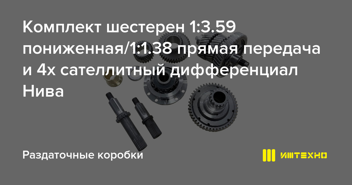 - Изменено передаточное отношения прямой передачи. При замене главных пар с 3.9 на 4.44 передаточное отношение в трансмиссии изменяется на 13%. Комплект ИЖ-ТЕХНО понижает прямую передачу на 15%, таким образом при установке данного комплекта замена стандартных главных пар на более тяговитые 4.44 (и при этом менее надежные) не требуется.